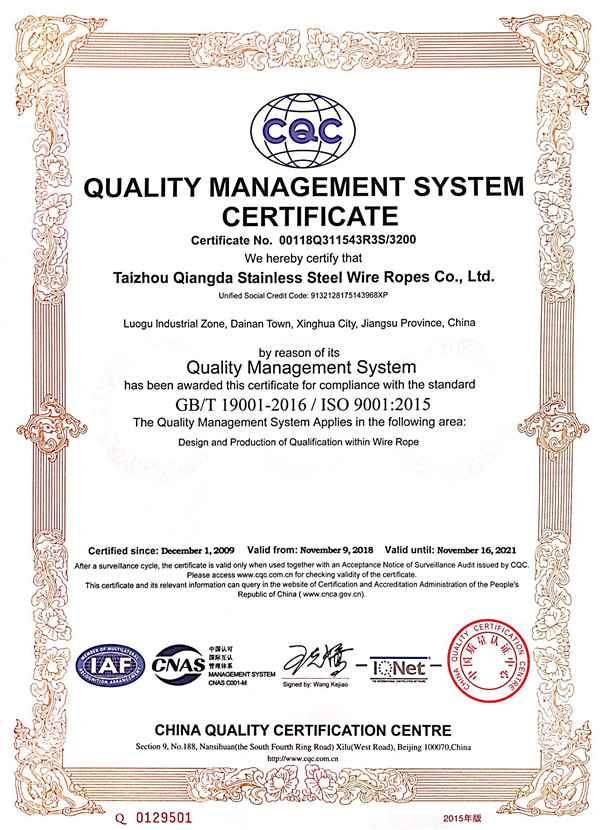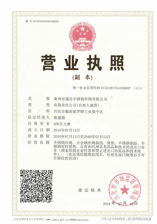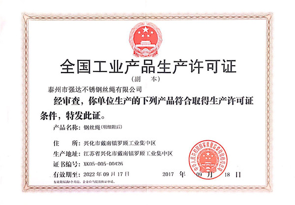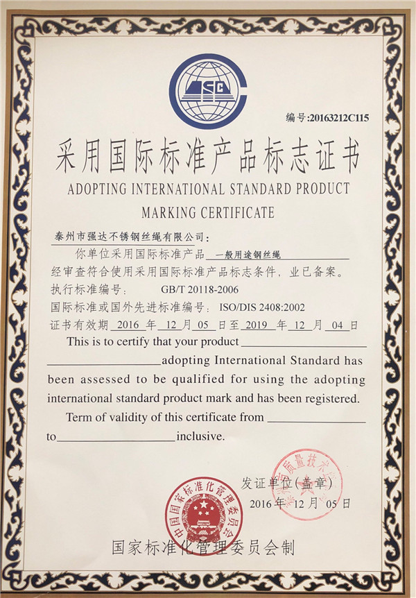 泰州市強(qiáng)達(dá)不銹鋼絲繩有限公司位于江蘇興化市戴南經(jīng)濟(jì)開(kāi)發(fā)區(qū),公司致力于不銹鋼絲繩產(chǎn)品生產(chǎn),立志成為“國(guó)內(nèi)技術(shù)標(biāo)桿型吊索具生產(chǎn)企業(yè)”。以此戰(zhàn)略思想指導(dǎo),公司堅(jiān)決貫徹“質(zhì)量贏(yíng)市場(chǎng),管理增效益,誠(chéng)信贏(yíng)天下”的質(zhì)量方針。以完善的服務(wù)在國(guó)內(nèi)不銹鋼絲繩市場(chǎng)樹(shù)立良好的品牌形象。公司榮獲“江蘇省質(zhì)量信得過(guò)企業(yè)。 靈活的管理機(jī)制,經(jīng)驗(yàn)豐富的